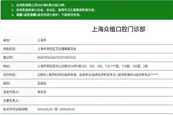 上海曹杨众植口腔医院是经上海市普陀区卫生健康委员会审批设立,登记号为MAD7R3A3031010719D1522,执业许可证有效期至2030年。上海曹杨众植口腔医院作为连锁品牌,与西郊众植同属一家集团,2023年正式成立;