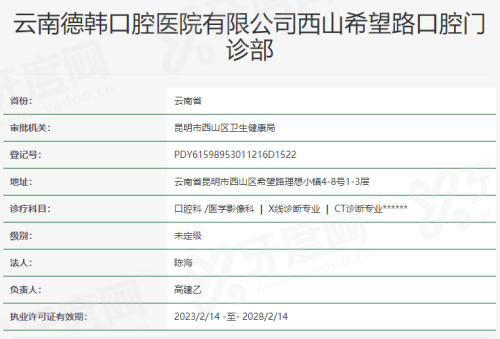 1、云南德韩口腔医院是经当地卫生健康委员会严格审批成立的二级口腔专科医院,拥有独立的医疗机构执业许可证,这意味着其在科室设置、人员配备和硬件设施上都达到了国内规定的较高标准,并非普通的小诊所可比。
